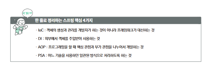 도서 저자님의 깃허브 주소 ( chap 2 ) : https://github.com/shinsunyoung/springboot-developer/tree/main/chapter2 LOC (Loose Coupling):객체 간 의존성을 최소화하여 시스템의 유연성과 재사용성을 높이는 기법.객체들이 강하게 결합되지 않도록 하여 변경 시 영향을 최소화하는 방법.DI (Dependency Injection):객체의 의존성을 외부에서 주입받는 기법.객체 간 결합도를 낮추고 테스트 용이성을 높이는 방식.AOP (Aspect-Oriented Programming):공통 기능을 분리하여 코드 중복을 줄이고 관심사를 분리하는 기법.특정 지점에서 기능을 적용하기 위해 어드바이스와 포인트컷을 사용하는 방법.PSA (Publi..