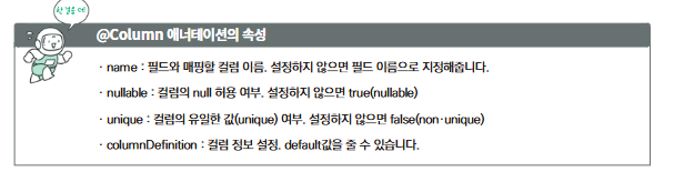 - 각 엔터티는 기본 키(primary key)를 가져야 하며, 이를 @Id 어노테이션을 사용하여 지정합니다.