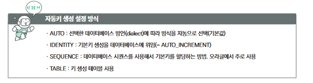 기본 키 생성 | @GeneratedValue 어노테이션을 사용하여 기본 키 자동 생성 | 수동으로 기본 키를 설정하거나 데이터베이스에서 자동 증가 설정 |