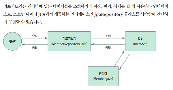 스프링 데이터 JPA 에서는 스프링 데이터의 인터페이스인 PagingAndSortingRepository 를 상속받아 JpaRepository 인터페이스를 만들었으며 , JPA를 더 편리하게 사용하는 메서드를 제공함 .