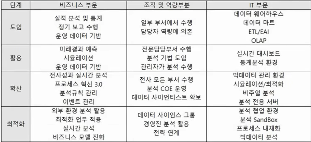 - 데이터 , 인력 , 조직 , 분석업무 , 분석기법 적용 안되어 사전 준비 필요